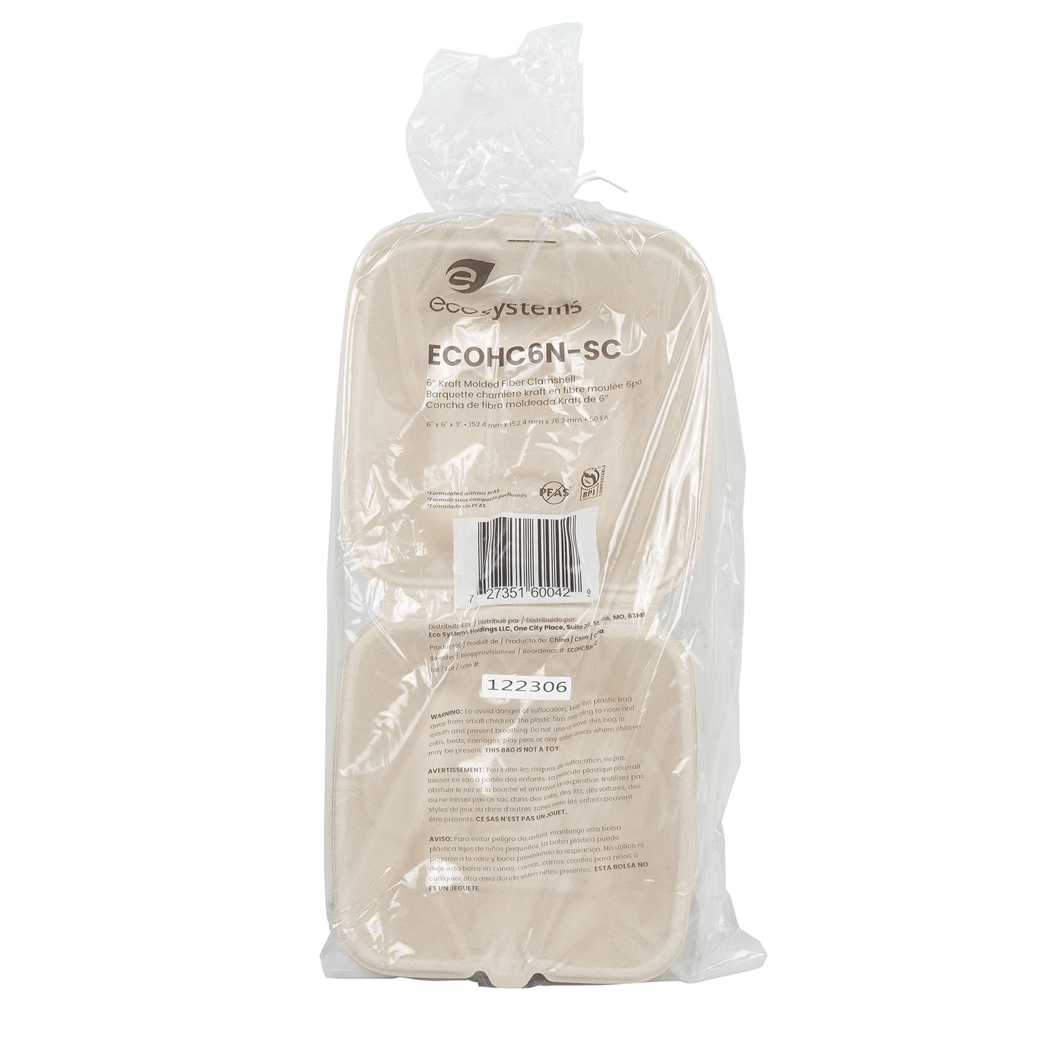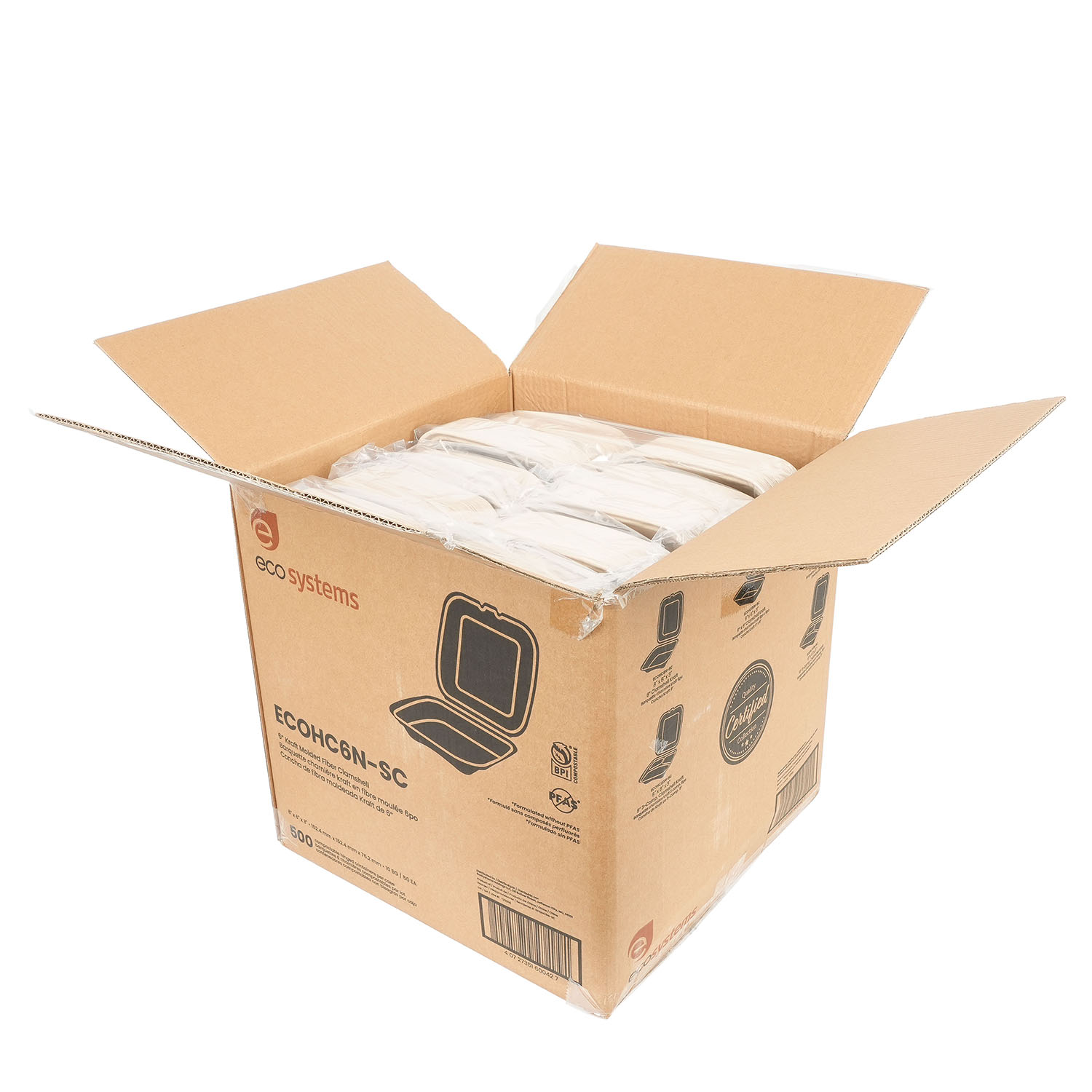 EcoSystems Formulated Molded Fiber Clamshell Container, Kraft, 6″, No Intentionally Added PFAS